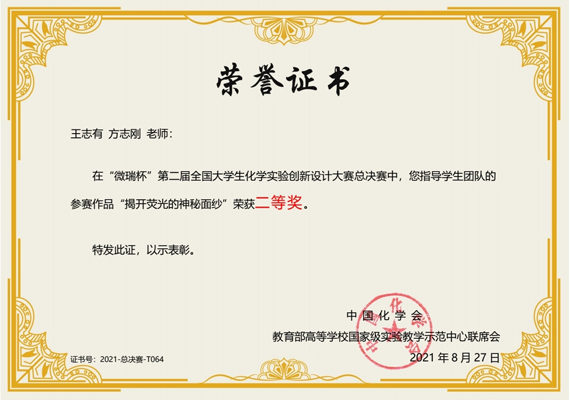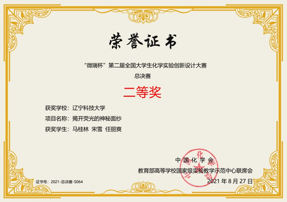 8月25日-27日,“微瑞杯”第二届全国大学生化学实验创新设计竞赛全国总决赛在青岛科技大学举行。米兰app官网版下载官方版化学工程学院应用化学系马桂林、宋雪、任丽爽3人团队的科普实验作品“揭开荧光的神秘面纱”(指导老师:王志有、方志刚)获二等奖。
