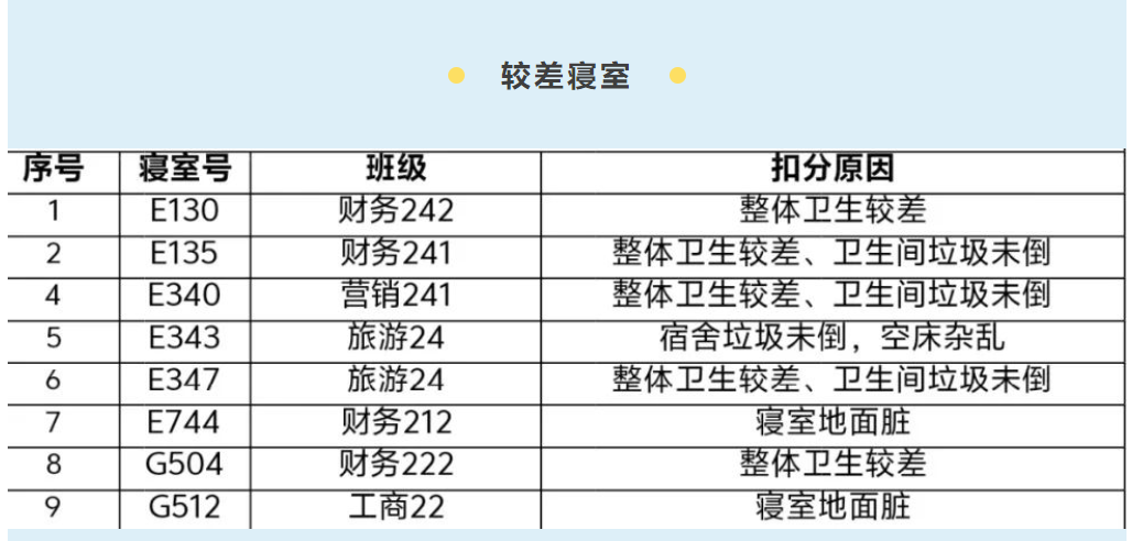 为进一步落实“三比一促一传承”“好习惯工程”工作要求,帮助同学们养成良好的生活习惯,进一步加强学生宿舍的内务建设,营造整洁舒适的居住环境,工商管理学院定期开展学生寝室内务大检查。现将检查结果通报如下: