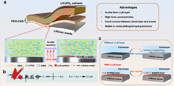 金属锂负极具有极高的理论比容量(3860mAh g-1)和超低的电化学势(−3.04 V vs SHE)备受关注,然而在实际应用过程中,由于其界面不稳定性等原因仍面临巨大挑战。安百钢教授团队与学校特聘教授,南京理工大学孙呈郭教授合作,利用原位热分解2,2′-偶氮二异丁腈(AIBN)添加剂,在聚合物固态电解质与金属锂负极之间构建了一种稳定高效的氮化锂(Li3N)中间层,有效解决了电解质与电极之间界面处离子电导率低、接触差、不稳定等问题。相关成果“Thermal Decomposition Assisted Construction of Nano-Li3N Sites Interface Layer Enabling Homogeneous Li Deposition”在线发表于《ChemSusChem》。DOI:10.1002/cssc.202202220。论文第一作者为化工学院2021级博士研究生李洪洋。